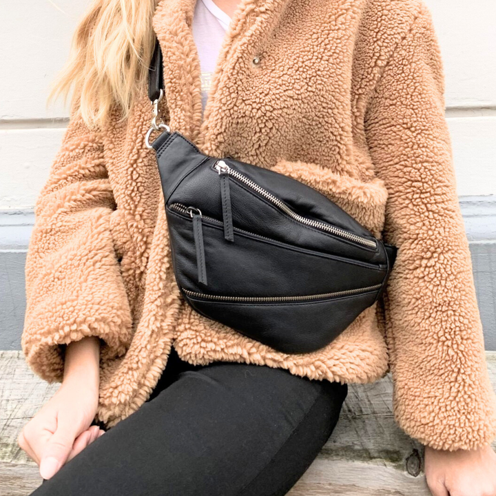 Style Frisco i sort. Stor bumbag / bæltetaske i smukt læder med mange rum og lommer