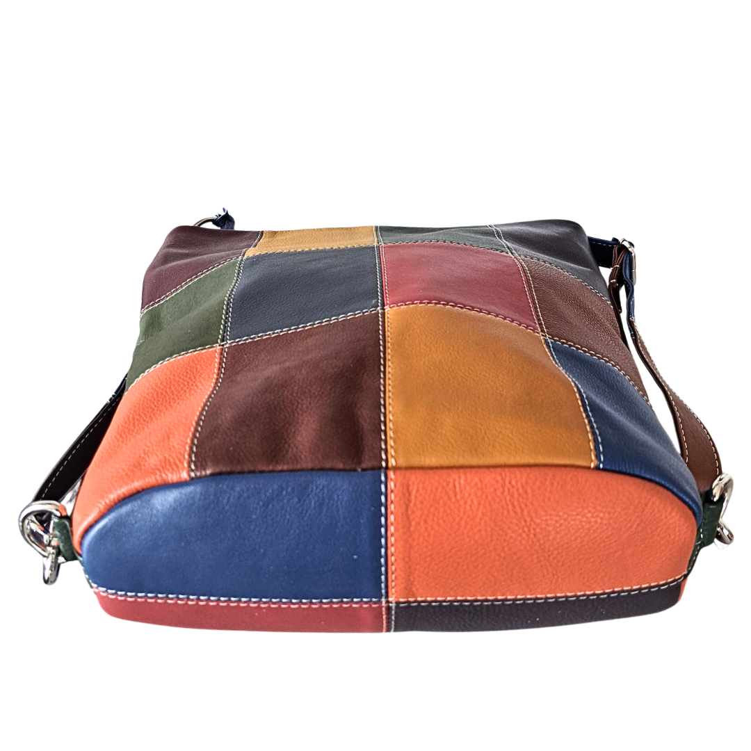 √    Taskens brede bund går i ét med taskens design og består af fire kvadrater sammensyet af fire forskellige lædertyper i farver fra tasken og med samme flotte kontrastsyninger.