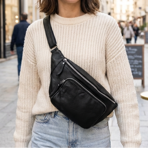 Style Paris i sort. Flot unisex bumbag i kraftigt kvalitetslæder m. stort hovedrum og stor flot frontlomme