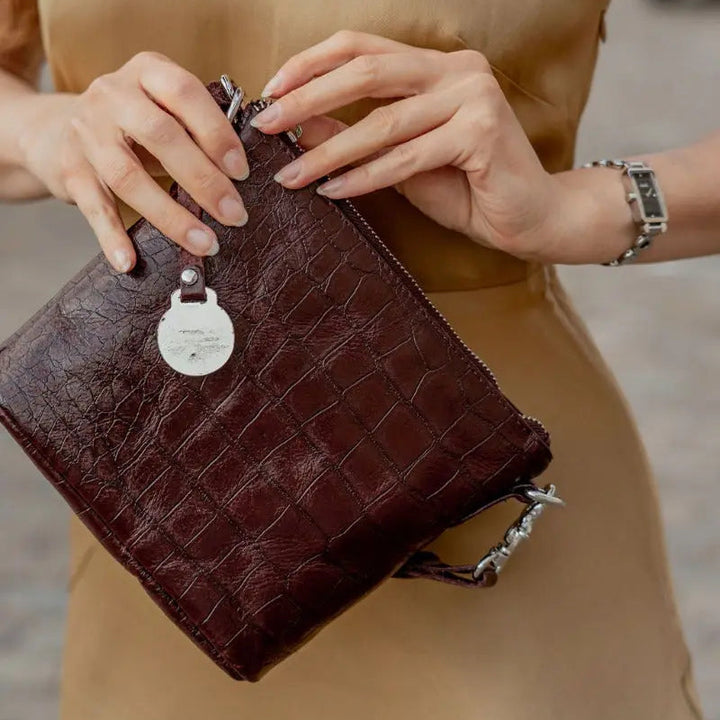 Style Kosovo i smukt sort krodillepræget læder (kun to stk. på lager). Herlig kombineret clutch, håndtaske, skuldertaske