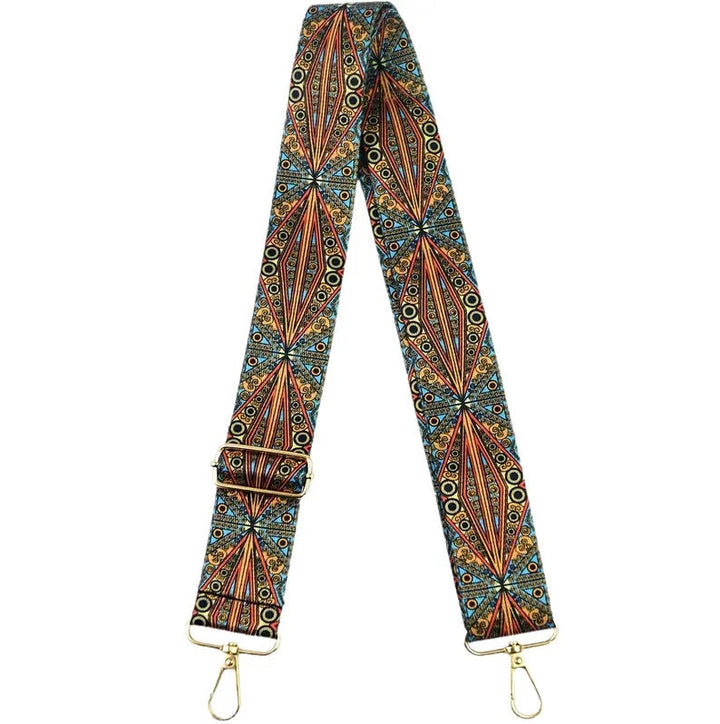 BEMÆRK: Kollektionsprøve. Style N52. Kan sendes d. 28/1/26. Justerbar skulderrem til tasker med ringe i guld. Materiale: Nylon. Farve: Multi, påfulg