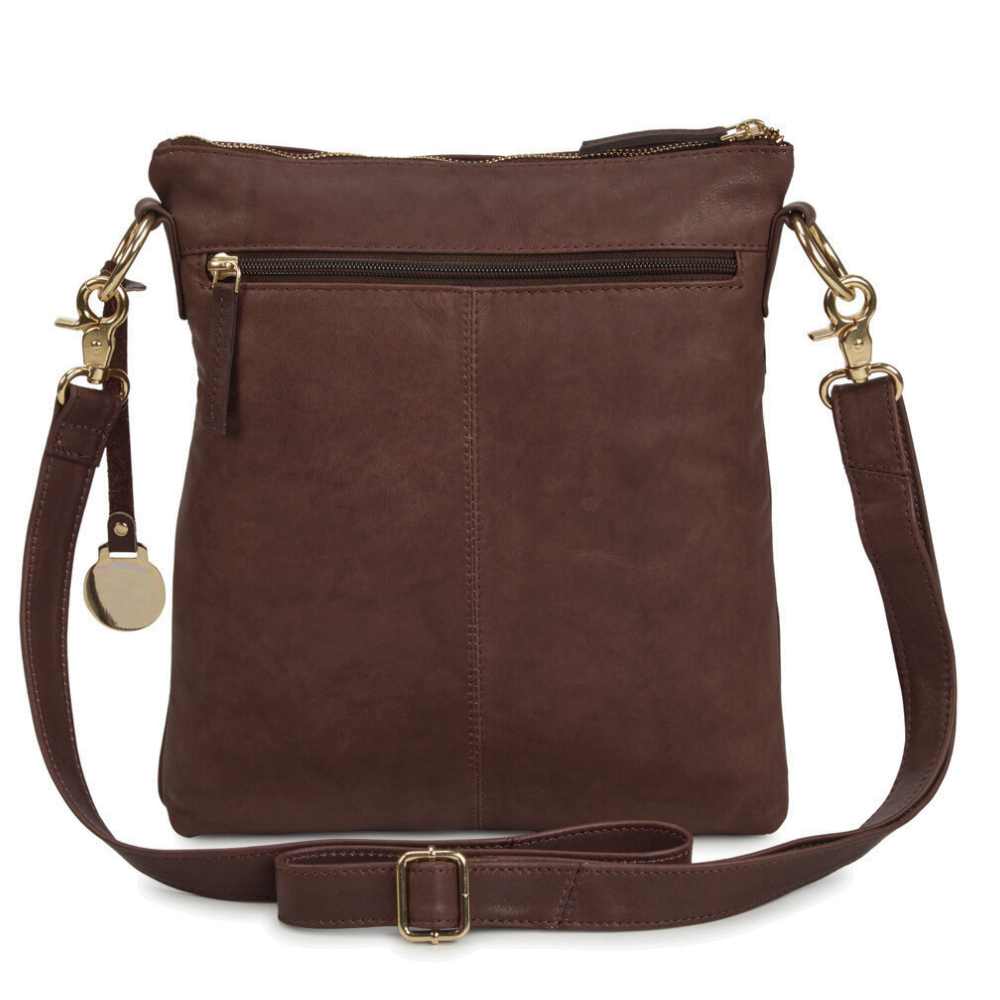 Style Ophelia i mørkebrun. Superflot skulder- og crossovertaske med smukke lynlåse, ringe & karabiner i guld
