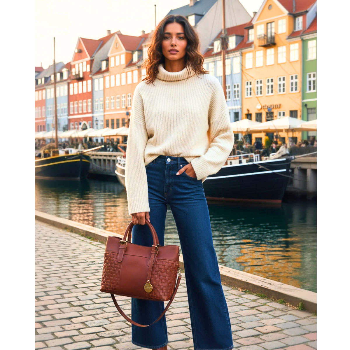 Style Panama i flot mørkebrun. Eksklusiv hånd-, skulder, og crossovertaske i læder med smukke flettede detaljer