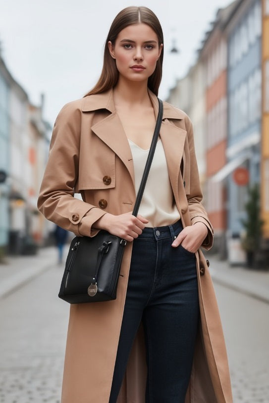 Foran på tasken finder du et elegant, lodret lynlåsrum, der både er dekorativt og praktisk. På bagsiden gemmer tasken på endnu et udvendigt rum med lynlås – perfekt til hurtig adgang til dine vigtigste essentials.