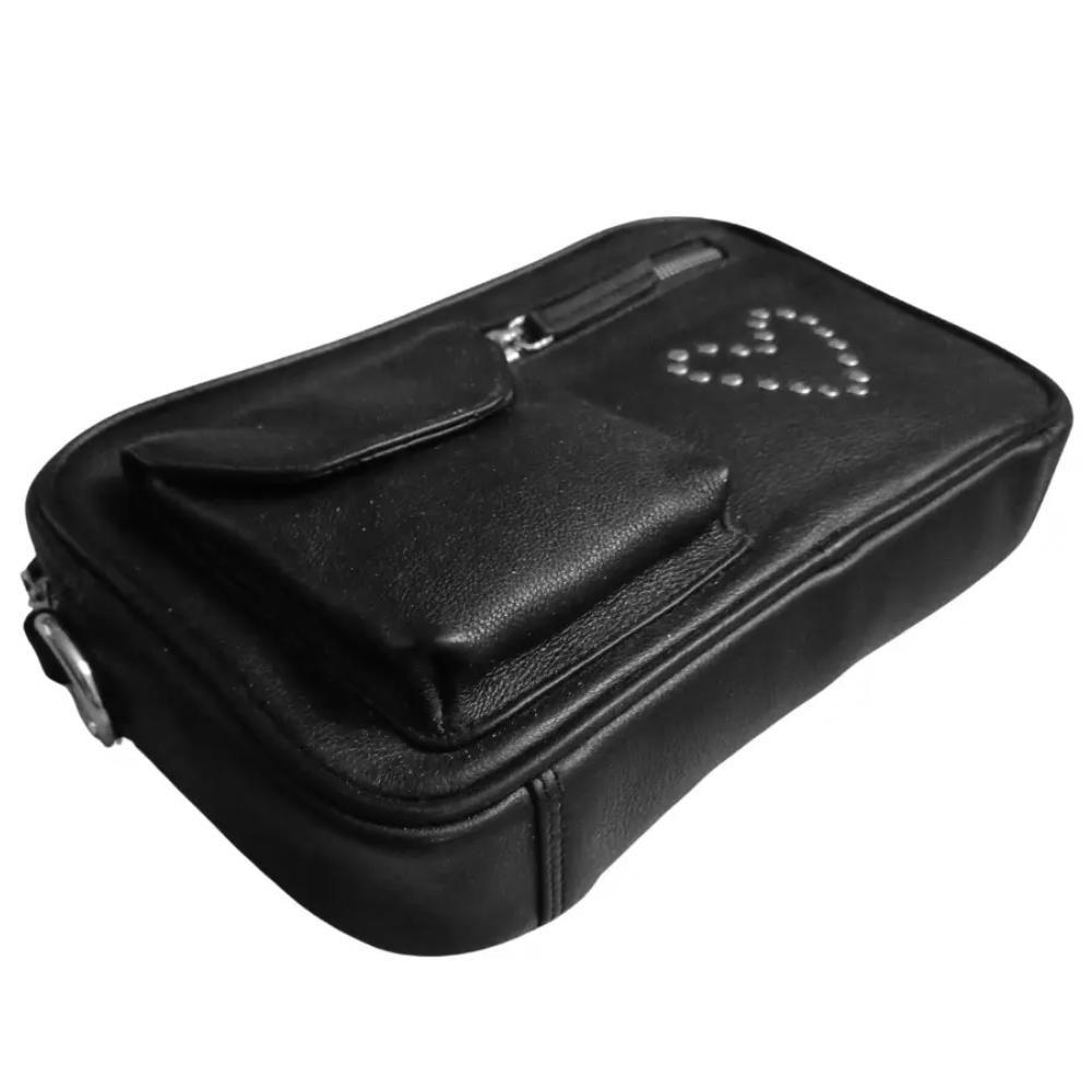 Denne total fede skulder- og crossbodytaske, style Orion, kommer i smukt sort kvalitetslæder og med masser af rum og lommer og med smuk fittings og nitter i sølv. Tasken kan bruges til de fleste lejligheder og er specielt suveræn til ferier, byture festivaler og til almindelig daglig brug. Style Orion blev kun produceret op med fittings i guld, og dette er derfor den eneste style Orion med sølv.