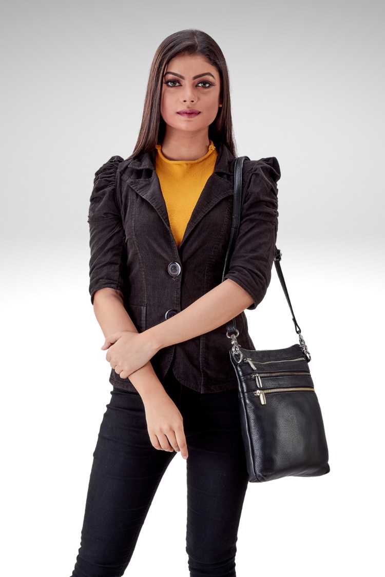 Skuldertasken, som er produceret i kvalitetsskind (ko), har et stort hovedrum på fronten og yderligere et stort lynlåsrum på bagsiden. Herudover er der yderligere to gode rum med lynlås på fronten.